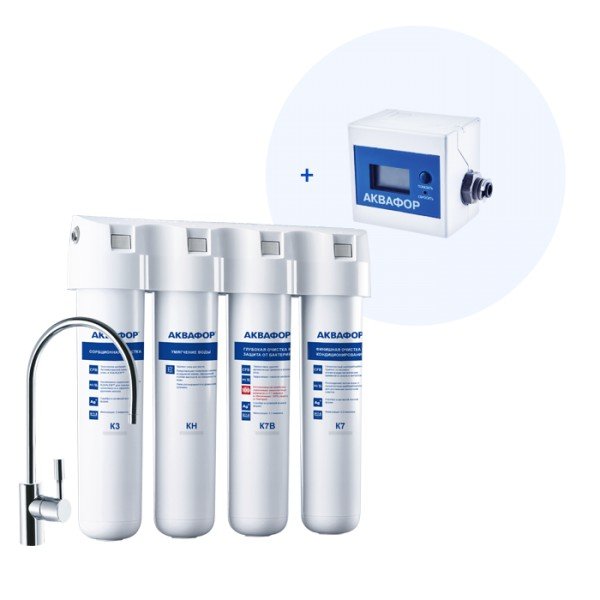 Обратноосмотические фильтры используются для абсолютной защиты от накипи, т.к. полностью устраняют соли жесткости из воды.нетЧисло ступеней очисткиКартриджи последовательно очищают воду и от видимых примесей, и от растворенных. Первый картридж задерживает более крупные частицы, а каждый последующий - более мелкие. Чем больше ступеней - тем лучше фильтр очистит воду: поймает более мелкие видимые частицы ржавчины, песка и ила, успеет захватить из воды максимум растворенных примесей - хлора, нитратов, тяжелых металлов и других.4МинерализацияПроисходит после финишной очистки воды. Необходима прежде всего в фильтре обратного осмоса, поскольку такой фильтр полностью устраняет из воды все примеси, в том числе минералы. Минералы добавляются в оптимальной концентрации - для пользы и привычного вкуса воды.нетПостфильтрацияФинальный этап очистки воды: картриджи постфильтрации удаляют самые мелкие механические частицы и кондиционируют воду, придавая ей более приятный вкус.нетНакопительная емкостьОбычно нужна в фильтрах обратного осмоса. Глубокая фильтрация требует времени. Чтобы Вам не приходилось ждать, пока вода наберется в чайник или кастрюлю, почти во всех моделях используется накопительный бак для чистой воды или другая емкость. В стандартном фильтре обратного осмоса под мойку воды в баке достаточно для семьи из 5-6 человек.нетФильтрующий модуль в комплектедаОтдельный крандаДавление в водопроводе не более, атмМаксимальное давление воды на входе в систему, при котором возможна стабильная работа фильтра.6,5Ширина, смОбратите внимание на габариты фильтра, и измерьте, сколько свободного пространства в предполагаемом месте установки.26,0Глубина, смОбратите внимание на габариты фильтра, и измерьте, сколько свободного пространства в предполагаемом месте установки.9,0Защита корпуса от гидроударовдаИсходная водаЖесткая вода – вода с избытком минеральных солей. От нее появляется накипь в чайнике, известковый налет на сантехнике и разводы на посуде. Мягкая вода – та, в которой мало минеральных солей. Нет накипи в чайнике и разводов на посуде. Фильтры для мутной воды и фильтры от ржавчины, как правило, имеют несколько стадий очистки и дополнительный полипропиленовый картридж. Он задерживает механические частицы ила, песка и ржавчины и защищает картриджи более глубокой очистки.жёсткаяУстраняет мутностьМутность водопроводной воды может говорить о том, что в ней много мелких механических частиц. Важно, чтобы в фильтре был установлен дополнительные картридж механической предфильтрации (полипропиленовый) - он продлит жизнь остальным картриджам более тонкой очистки.даУстраняет ржавчину, бурый осадокЛюбой фильтр под мойку удалит из воды крупные и мелкие частицы ржавчины. Некоторые фильтры имеют повышенный ресурс по железу: они дольше служат в такой воде, поскольку лучше подходят для удаления из воды железа и механических частиц ржавчины.нетЗащита от бактерийВсе проточные фильтры в той или иной степени защищают от бактерий. Например, добавление серебра препятствует их размножению. Это стандартная степень защиты. Если в семье есть дети, пожилые люди или аллергики, воду рекомендуется обеззараживать, то есть полностью удалять микроорганизмы. Повышенную защиту от бактерий дают фильтры с половолоконной мембраной. Это пучок тру